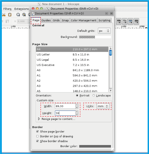 .Certífiquese que añade 4mm (0,4cm) a la altura y ancho de su archivo. En el caso de una tarjeta de visita con 8,5x5,5cm, coloque 8,9x5,9cm.